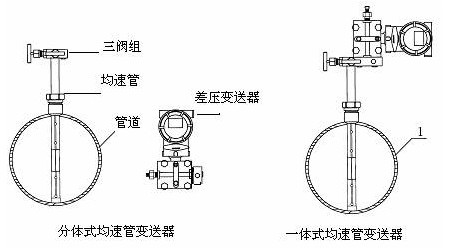 由均速管流量传感器和差压变送器组成。有分体式安装和一体式安装两种结构。